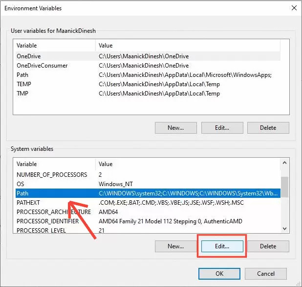 STEP 3: Now, You can see the system variables list then Select the “Path” Option. Then click the “Edit” and “OK”.