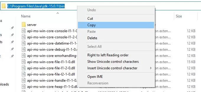 STEP 1:First you can go to the java path section folder and copy the full path. Go to the java directory file C:Program FilesJavajdk-15.0.1bin copy the path.